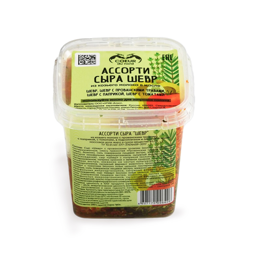 Сыр «Шевр» с прованскими травами (молоко козье цельное пастеризованное, смесь пряностей «Прованские травы» (розмарин, тимьян, базилик), соль поваренная пищевая экстра, закваска на чистых культурах мезофильных микроорганизмов, сычужный фермент животного происхождения), сыр «Шевр» с паприкой (молоко козье цельное пастеризованное, паприка красная и зеленая сушеная, соль поваренная пищевая экстра, закваска на чистых культурах мезофильных микроорганизмов, сычужный фермент животного происхождения), сыр «Шевр» с томатами (молоко козье цельное пастеризованное, томаты сушеные, соль поваренная пищевая экстра, закваска на чистых культурах мезофильных микроорганизмов, сычужный фермент животного происхождения.), сыр «Шевр» (молоко козье цельное пастеризованное, соль поваренная пищевая экстра, закваска на чистых культурах мезофильных микроорганизмов, сычужный фермент животного происхождения), масло подсолнечное рафинированное дезодорированное с добавлением рафинированного оливкового масла.
