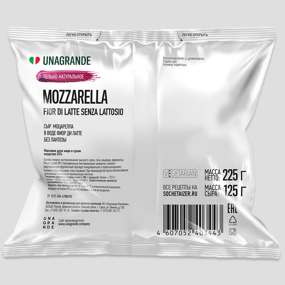 Сыр моцарелла "Фиор ди Латт" без лактозы в воде Unagrande 45%, 125 г