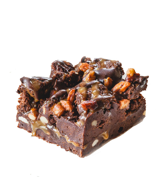 Шоколадный десерт с мягкой карамелью, цельным миндалём, грецким орехом и карамелизированным орехом пекан.