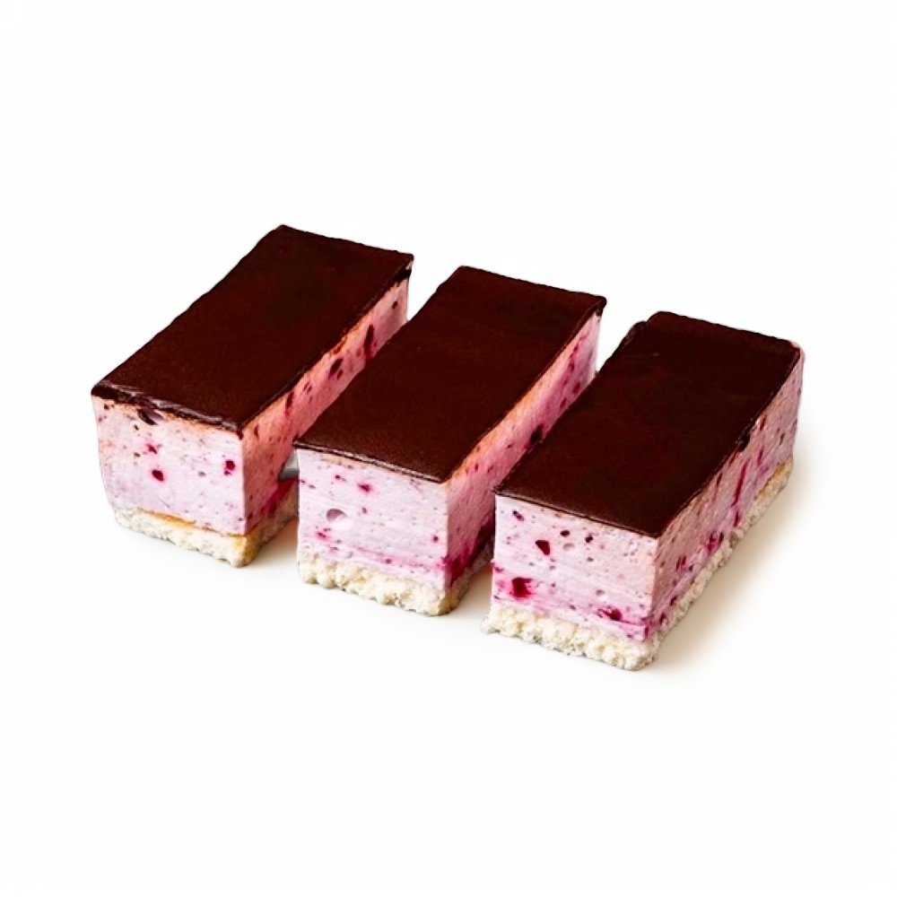 Воздушное суфле с черносмородинновом джемом на нежном рулетном бисквите. Поверхность торта покрыта темной кондитерской глазурью.