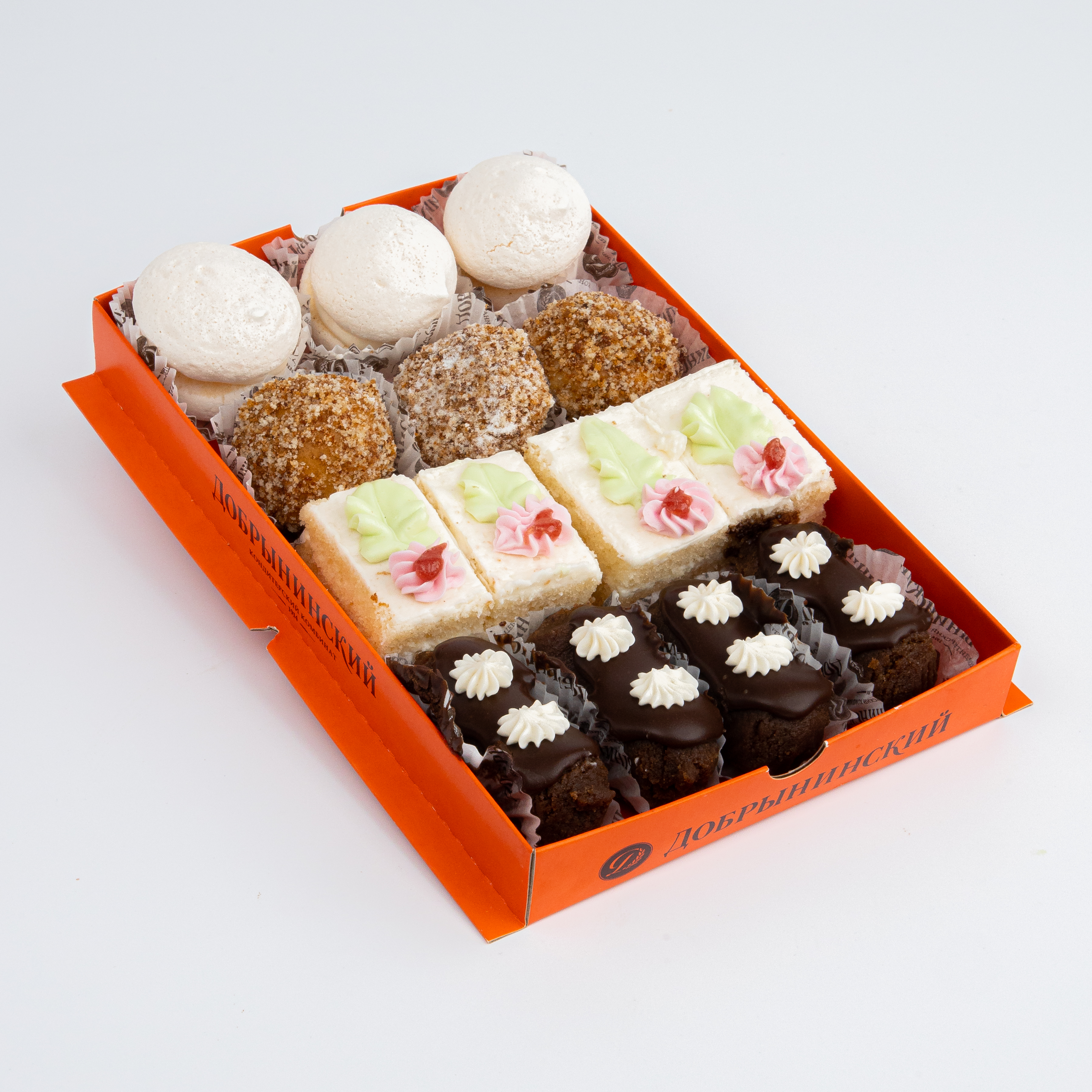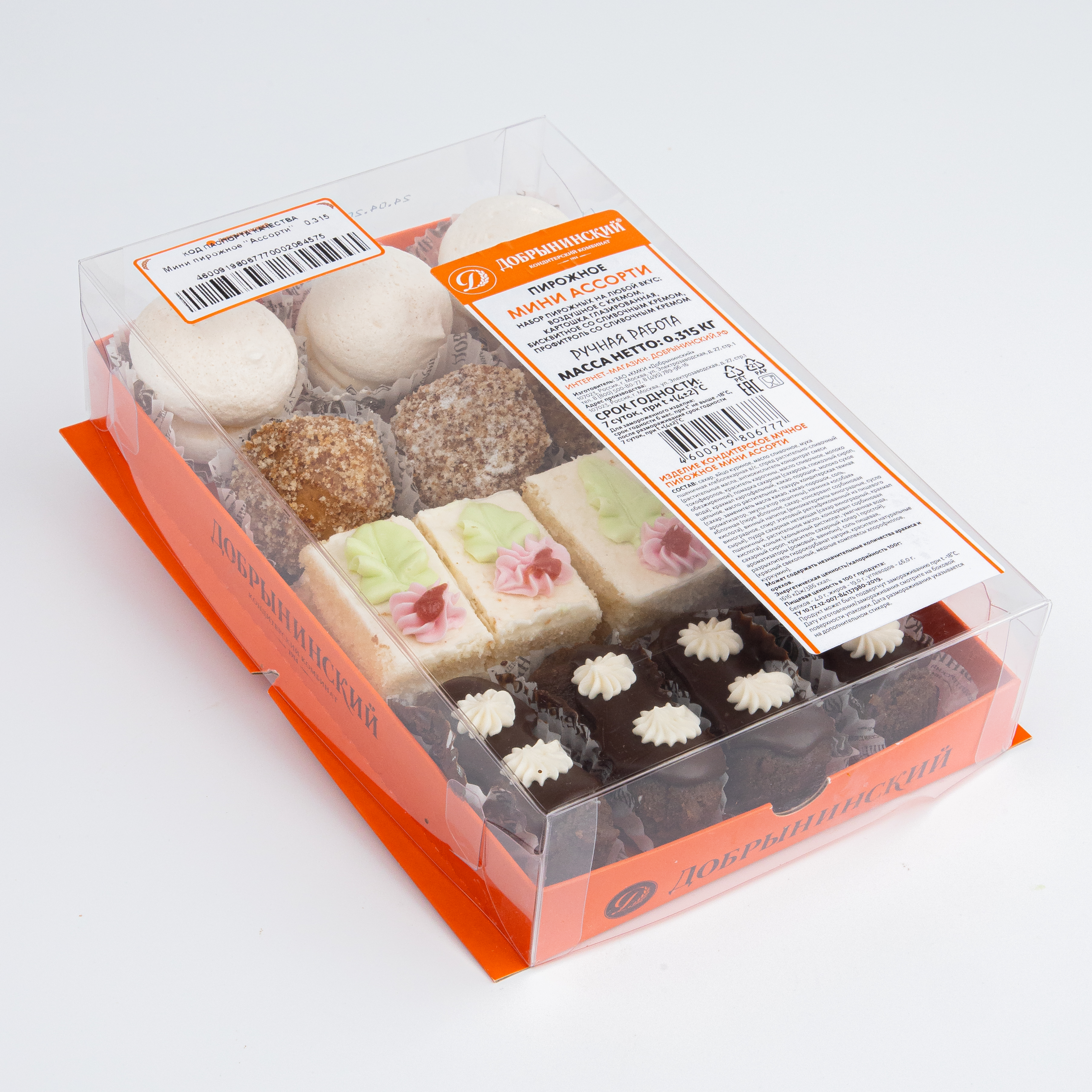Сахар, яйцо куриное, масло сливочное, мука пшеничная хлебопекарная в/с, помадка сахарная (сахароза, глюкозный сироп), крахмал картофельный, какао-порошок, молоко сухое, масло растительное подсолнечное, спред растительно-сливочный (заменитель молочного жира, масло сливочное, молоко обезжиренное, эмульгатор моно- и диглицериды жирных кислот, антиокислитель концентрат смеси токоферолов, краситель каротины), глазурь кондитерская (сахар, заменитель масла какао, какао-порошок, ароматизатор, эмульгатор лецитины), патока, винный напиток, повидло яблочное (пюре яблочное, сахар), пудра сахарная нетающая (сахар виноградный, крахмал пшеничный, растительное масло, ароматизатор ванилин), коньяк (коньячный дистиллят, умягченная вода, сахарный сироп, краситель колер сахарный), консервант сорбиновая кислота, ароматизаторы ромовый, ванилин, разрыхлители: карбонат аммония, гидрокарбонат натрия; натуральные красители пищевые красный свекольный, хлорофиллы, куркумин. Может содержать следы арахиса и орехов. Количество в упаковке: 14 шт.