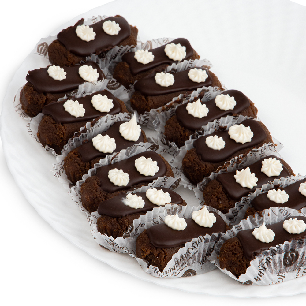 Нежный крошковый бисквит покрыт шоколадной помадкой и украшен сливочным кремом. Количество в упаковке: 14 шт. по 35 г.