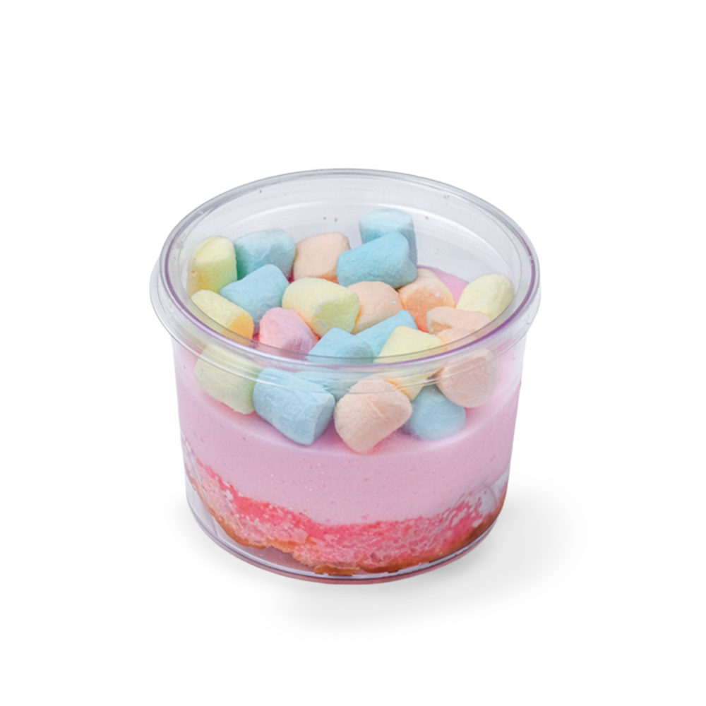 Трайфл Баблгам Страус — легкий порционный десерт в пластиковом стаканчике. Внутри — мягкие бисквитные коржи с прослойками из нежного крема и конфитюра. Десерт украшен разноцветным маршмеллоу.