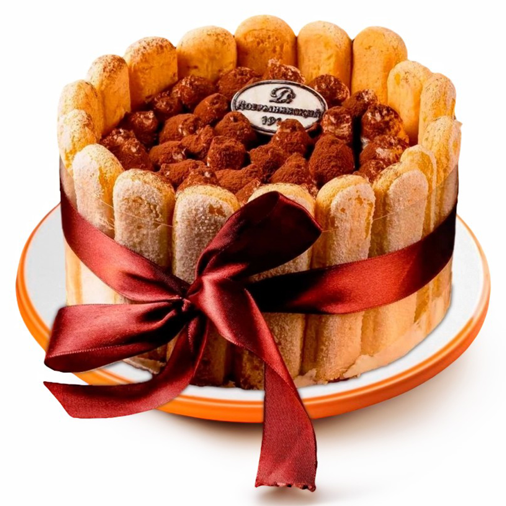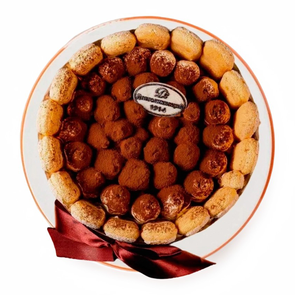 Слои нежного печенья Савоярди, пропитанные ароматным кофейно-ромовым сиропом, с прослойками из воздушного крема Тирамису и шоколадного ганаша. Верх торта украшен какао-порошком, а бока покрыты слоем Савоярди. Завершает композицию тонкая обертка из пищевой пленки и атласная лента, придающая десерту изысканный вид.