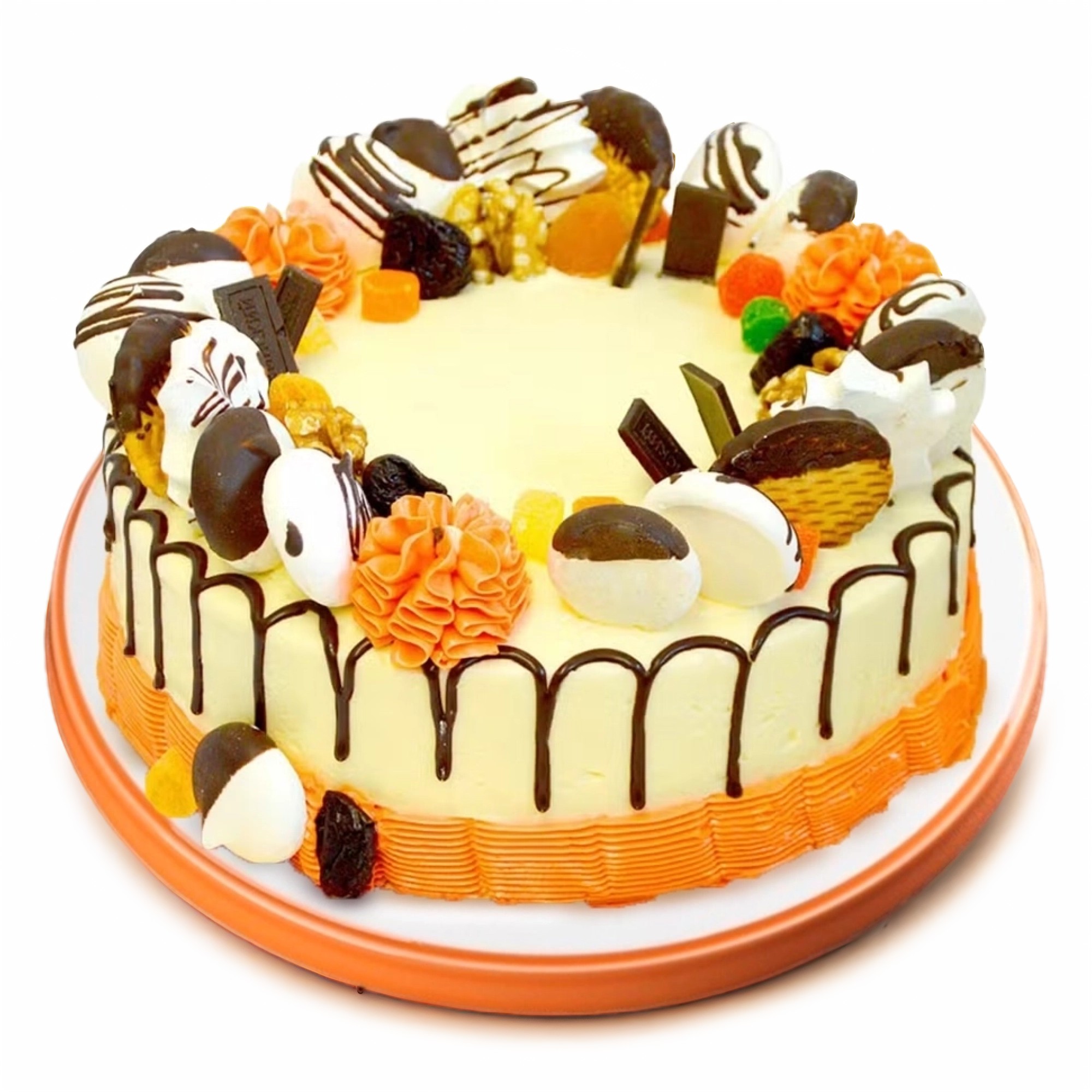 Мука пшеничная хлебопекарная в/с, яйцо куриное, сахар, масло сливочное, спред растительно-сливочный (заменитель молочного жира, масло сливочное, молоко обезжиренное, эмульгатор моно- и диглицериды жирных кислот, антиокислитель концентрат смеси токоферолов, краситель каротины), крем кондитерский со вкусом сгущенного молока (сахар, молоко сухое, жир молочный, заменитель молочного жира, стабилизатор полифосфат натрия), глазурь кондитерская (сахар, заменитель масла какао, какао-порошок, сыворотка молочная сухая, ароматизатор, эмульгатор лецитины), печенье сахарное (мука пшеничная, сахар, меланж яичный, жир кондитерский, антиокислитель токоферол, регулятор кислотности лимонная кислота, разрыхлитель гидрокарбонат натрия, эмульгатор лецитины), цукаты, чернослив, курага, винный напиток, орех грецкий, молоко сухое цельное, патока, консервант сорбиновая кислота, коньяк (дистилляты коньячные, вода питьевая, сахарный сироп, пищевая добавка сахарный колер), ароматизаторы ванильный, ромовый, регулятор кислотности кислота лимонная, красители кармин и курмин.Может содержать следы арахиса.
