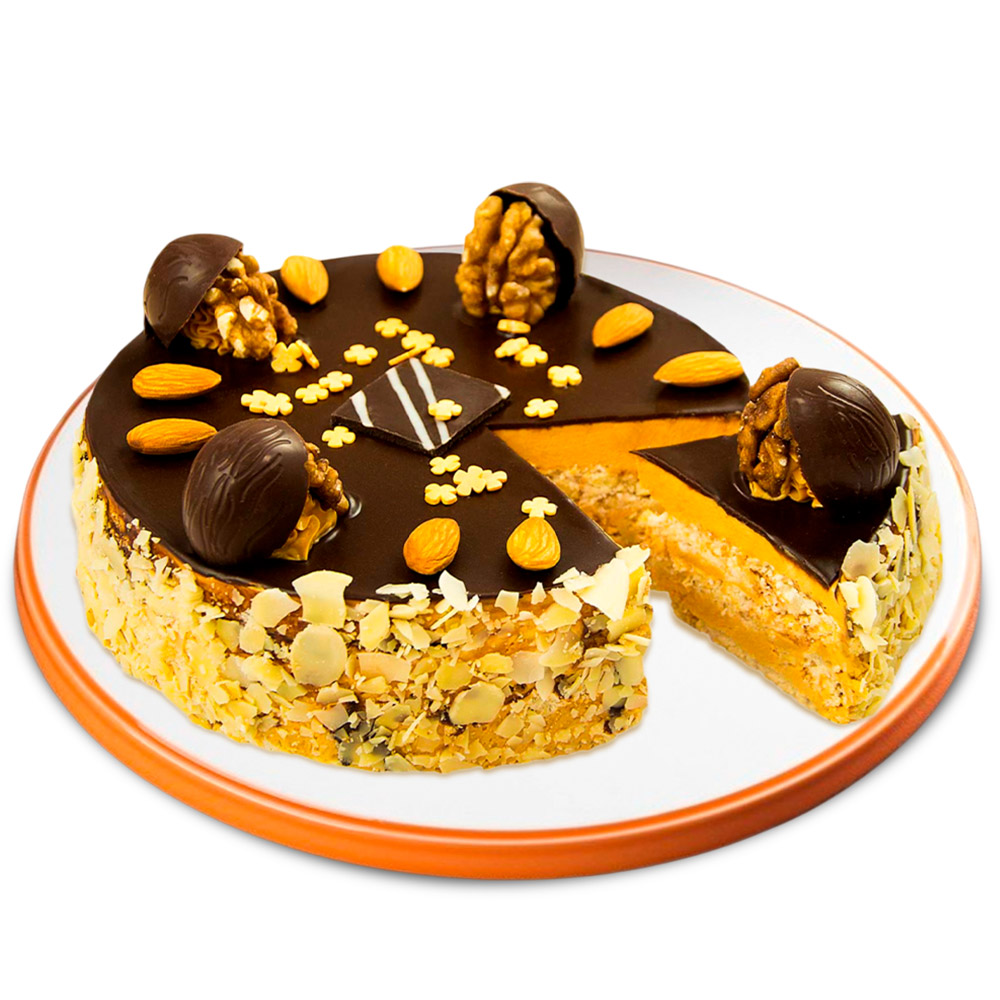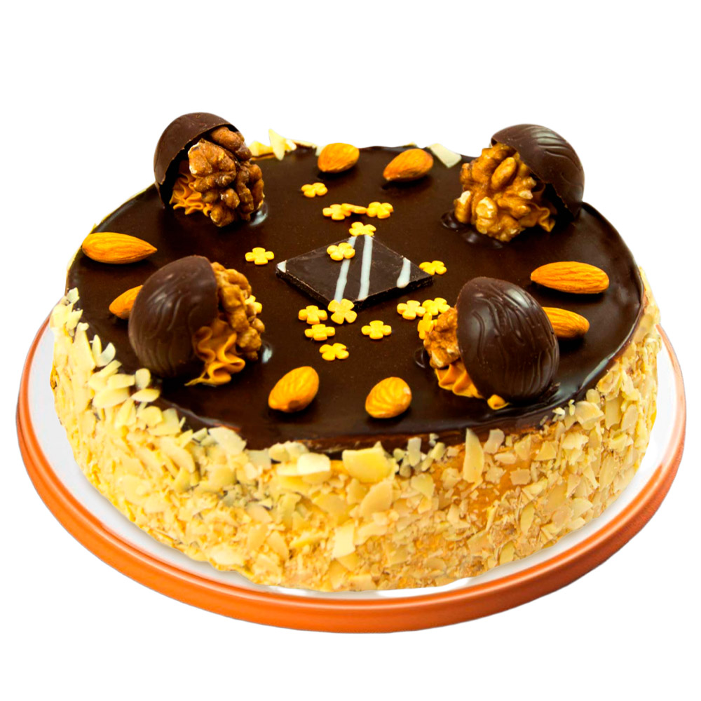 Поверхность покрыта ганашом, украшена грецкими орехами, миндалем и декоративной сахарной посыпкой. Боковая поверхность обсыпана миндальными лепестками.