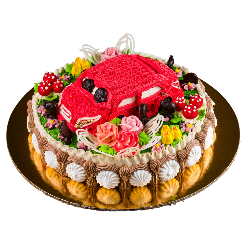 Пропитанные сиропом слои воздушного бисквита прослоенные сливочным кремом с джемом. Торт украшен сливочным кремом, заварными фигурками, кремовыми фигурками, темной глазурью и воздушным безе.