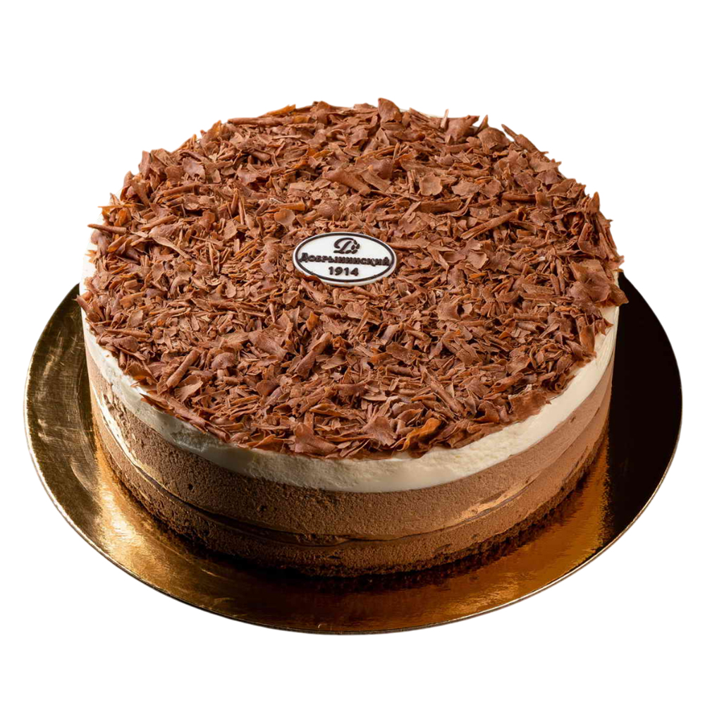 Пропитанные сиропом слои нежного шоколадного бисквита, прослоенные тремя видами мусса: мусс темный шоколад, мусс молочный шоколад, мусс белый шоколад. Украшен торт шоколадной глазурью, темной и белой кондитерской глазурью.