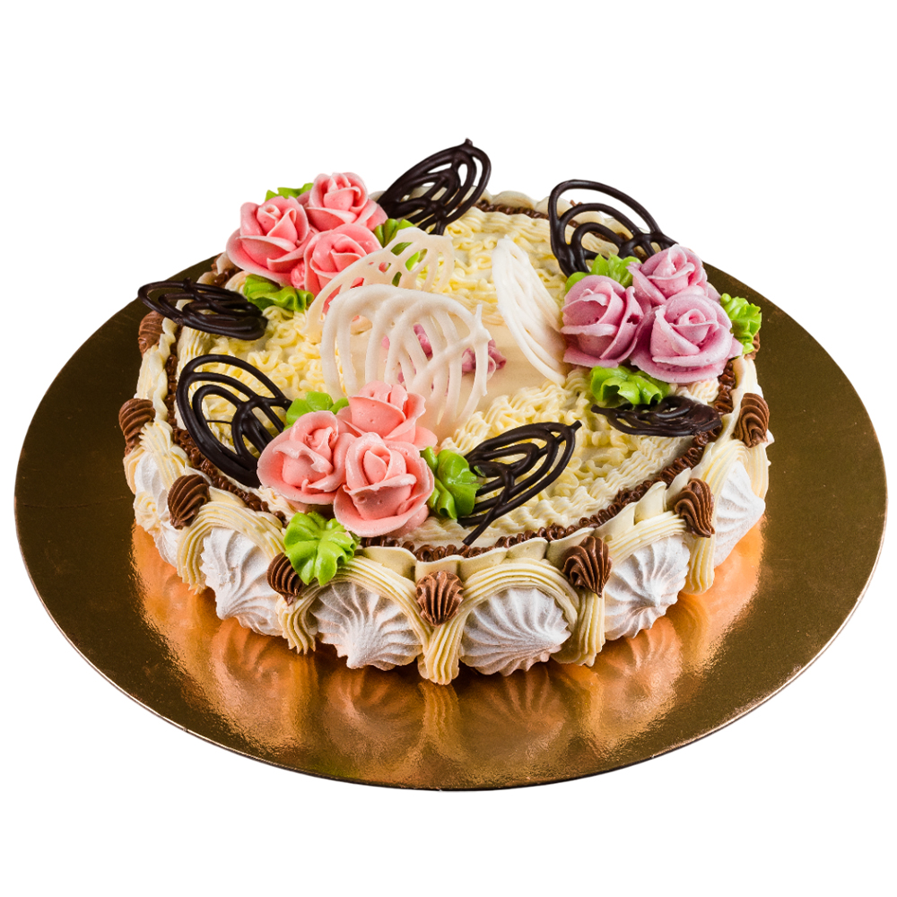Пропитанные сиропом слои воздушного бисквита прослоенные сливочным кремом с клюквенным джемом. Украшен торт сливочным кремом( белым и шоколадным), темной глазурью, воздушным безе