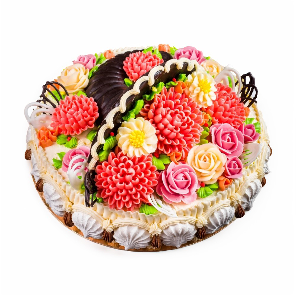 Пропитанные сиропом слои нежного бисквита прослоенные сливочным кремом с клюквенным джемом. Украшен торт сливочным и шоколадным кремами, воздушной и шоколадной фигурками.