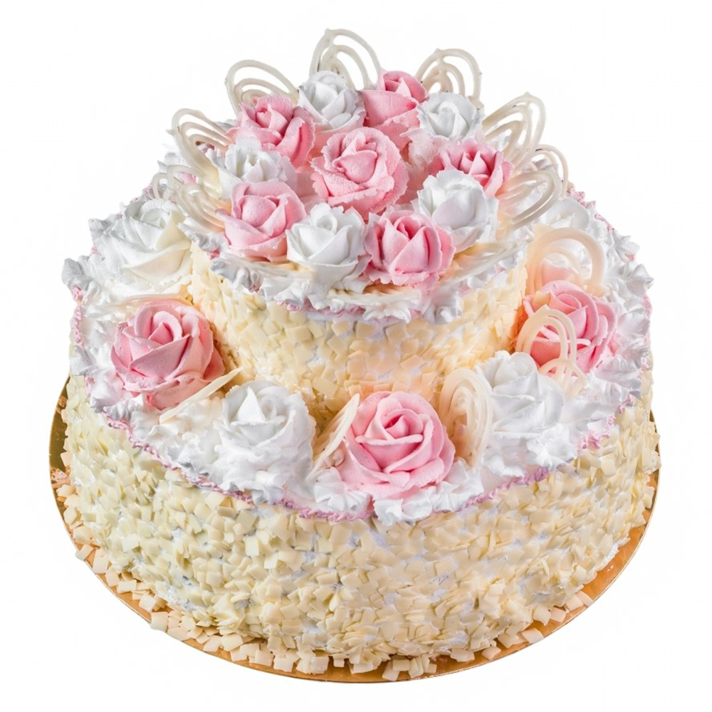 Пропитанные сиропом слои воздушного бисквита прослоенные сливочно-йогуртовым кремом. Украшен торт сливочным кремом. Диаметр торта: 27 см. Количество ярусов в торте уточняйте у оператора интернет-магазина.