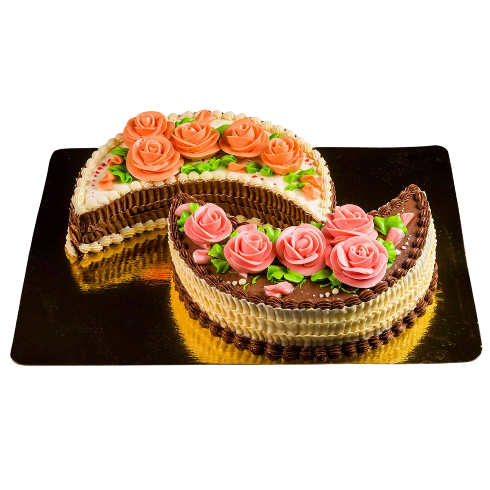 Слои классического бисквита пропитаны сиропом, прослоены сливочным кремом с джемом. Торт украшен цветами из сливочного крема, сливочным шоколадным кремом. Диаметр торта (полумесяц): 23 см.